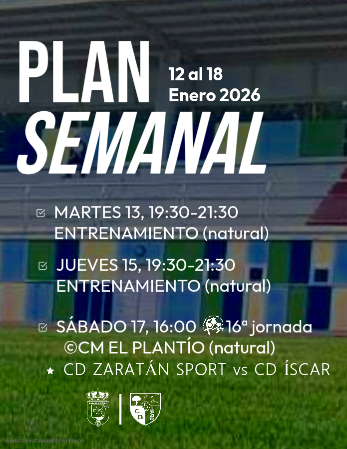Esta semana continuamos con el trabajo y la preparación de cara al encuentro del sábado. ¡Buena actitud y máxima concentración! 📅 Martes 13/01/2026🏋️ Entrenamiento de 19:30 a 21:30 en Natural 📅 Jueves 15/01/2026🏋️ Entrenamiento de 19:30 a 21:30 en Natural 📅 Sábado 17/01/2026⚽ Partido vs Zaratán en Zaratán🕛 Partido: 16:00 — Vestuario: 15:00🏟️ El PlantíoSigue leyendo "Plan Semanal | 12 al 18 de enero"