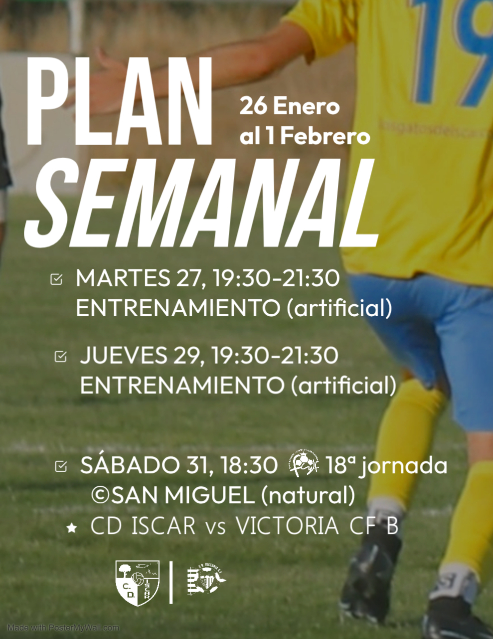 Esta semana preparamos el partido del sábado ante el Victoria CF.r Reservamos el césped natural de San Miguel entrenado en artificial. 📅 Martes 27/01/2026🏋️ Entrenamiento de 19:30 a 21:30 en artificial 📅 Jueves 29/01/2026🏋️ Entrenamiento de 19:30 a 21:30 en artificial 📅 Sábado 31/01/2026⚽ Partido vs Victoria CF🕛 Partido: 18:30 — Vestuario: 17:30🏟️ San MiguelSigue leyendo "Plan Semanal | 26 de enero al 1 de febrero"