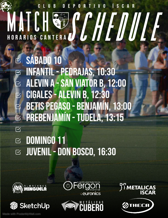 El Club Deportivo Íscar presenta los horarios de los encuentros correspondientes al fútbol base del próximo fin de semana, tras la vuelta de vacaciones de Navidad. 📅 Sábado 10 de enero Betis Pegaso – Benjamín, a las 10:00 Infantil – Pedrajas, a las 10:30 Alevín A – San Viator B, a las 12:00 Cigales –Sigue leyendo "Horarios de la Cantera – Fin de Semana 10 y 11 de enero"