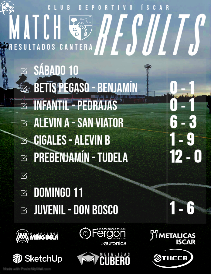 Los equipos de la cantera del Club Deportivo Íscar volvieron a competir este pasado fin de semana con muy buenos resultados en la mayoría de categorías. Estos fueron los marcadores: 📅 Sábado 10 de eneroBetis Pegaso – Benjamín ➜ 0 – 1Infantil – Pedrajas ➜ 0 – 1Alevín A – San Viator ➜ 6 –Sigue leyendo "Resultados de la Cantera – Fin de Semana 10 y 11 de enero"