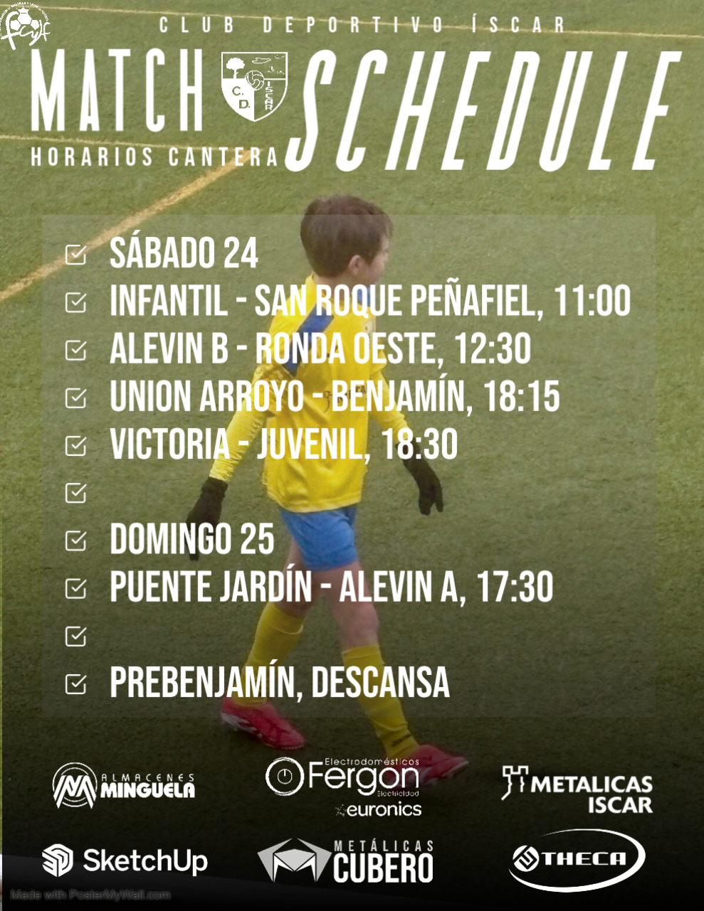 📆 Sábado 24 Infantil vs San Roque Peñafiel ⏰ 11:00 Alevín B vs Ronda Oeste ⏰ 12:30 Unión Arroyo vs Benjamín ⏰ 18:15 Victoria vs Juvenil ⏰ 18:30 📆 Domingo 25 Puente Jardín vs Alevín A ⏰ 17:30 👉 Prebenjamín: Descansa esta jornada. ¡Mucha suerte a todos nuestros equipos y gracias a las familias ySigue leyendo "🏟️ Horarios Cantera | Fin de semana 24 y 25 de enero"