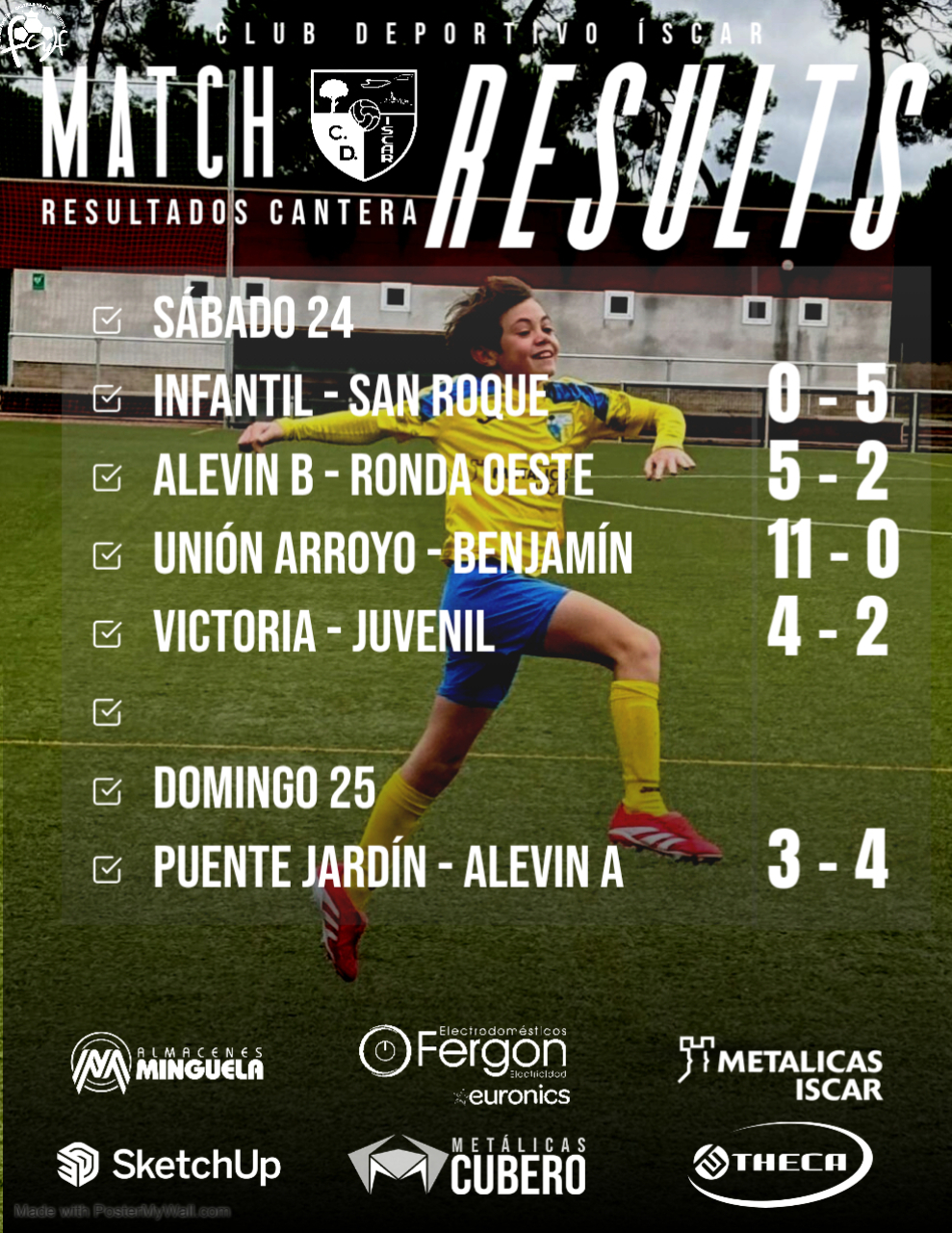Gran fin de semana para nuestra Cantera, con muy buenos resultados y un gran trabajo de todos nuestros equipos sobre el campo. Sábado 24Infantil vs. San Roque: 0–5Alevín B vs. Ronda Oeste: 5–2Unión Arroyo vs. Benjamín: 11–0Victoria vs. Juvenil: 4–2 Domingo 25Puente Jardín vs. Alevín A: 3–4 Seguimos creciendo, aprendiendo y disfrutando del fútbol. ¡EnhorabuenaSigue leyendo "Resultados Cantera – Sábado 24 y Domingo 25 de Enero"