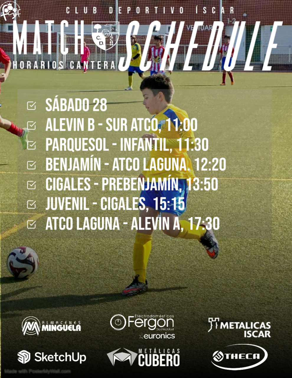 Este sábado 28 nuestra Cantera vuelve a la competición con una intensa jornada llena de fútbol y emoción. Estos son los partidos programados: ⚽ Alevín B – Sur ATCO ⌚ 11:00⚽ Parquesol – Infantil ⌚ 11:30⚽ Benjamín – ATCO Laguna ⌚ 12:20⚽ Cigales – Prebenjamín ⌚ 13:50⚽ Juvenil – Cigales ⌚ 15:15⚽ ATCO Laguna –Sigue leyendo "Horarios Cantera – Jornada Sábado 28 de febrero"