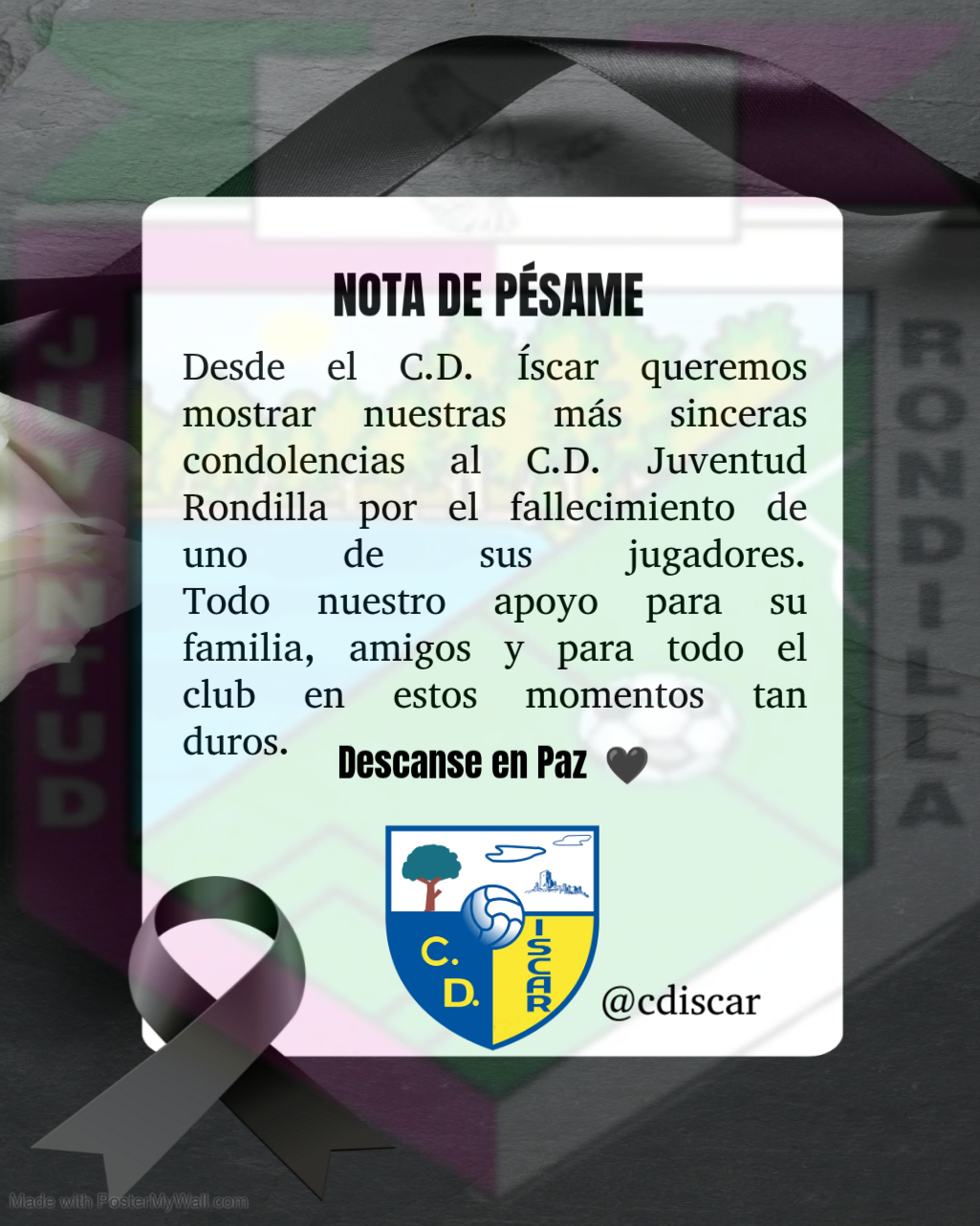 El C.D. Íscar quiere expresar sus más sinceras condolencias al C. D. Juventud Rondilla por el trágico fallecimiento de uno de sus jugadores. Desde nuestro club nos unimos al dolor de su familia, amigos, compañeros y de toda la entidad en estos momentos tan difíciles, enviándoles todo nuestro apoyo y cariño.Descanse en Paz. Así mismo,Sigue leyendo "Nota de Pésame"