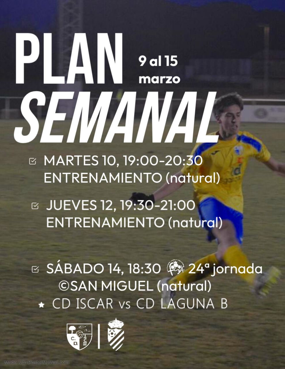 El Club Deportivo Íscar ya tiene definido el planning de trabajo para los próximos días, en una semana que combinará sesiones de entrenamiento con el partido correspondiente de liga del domingo. El equipo retomará el trabajo semanal con una sesión de entrenamiento programada para el martes de 19:00 a 20:30 horas.La sesión se realizará enSigue leyendo "Plan de Trabajo | Semana del 2 al 8 de marzo"