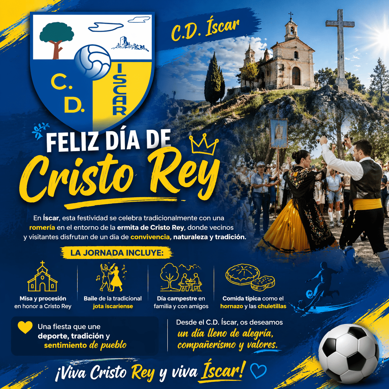 En Íscar, esta festividad se celebra tradicionalmente con una romería en el entorno de la ermita de Cristo Rey, donde vecinos y visitantes disfrutan de un día de convivencia, naturaleza y tradición. villadeiscar.es ⛪ La jornada incluye:• Misa y procesión en honor a Cristo Rey• Baile de la tradicional jota iscariense• Día campestre en familiaSigue leyendo "Feliz Día de Cristo Rey"