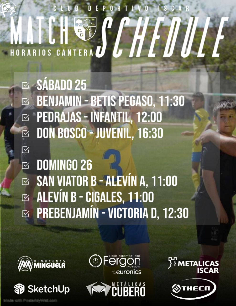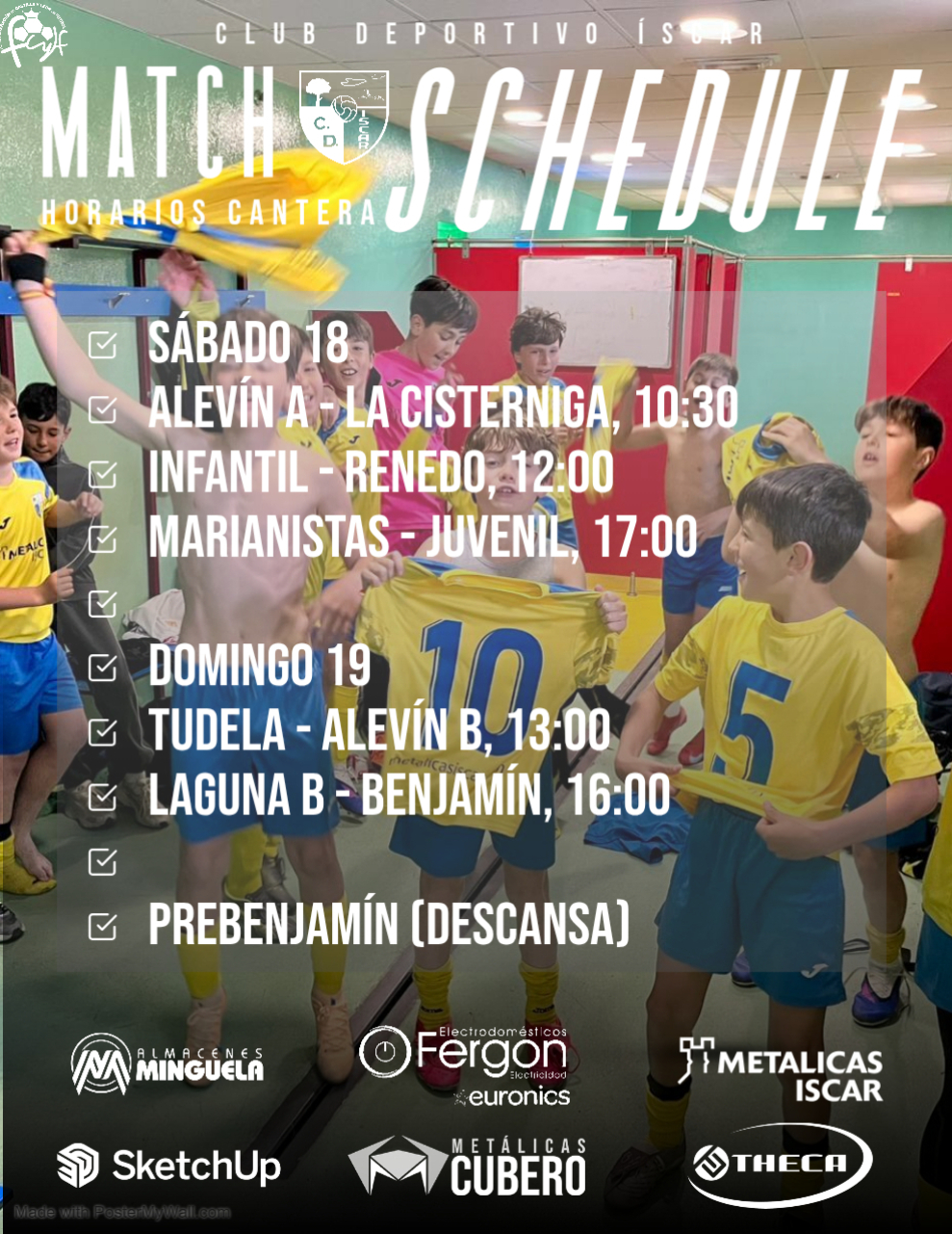 La cantera del Club Deportivo Íscar vuelve a la competición este fin de semana con 5 encuentros entre el sábado y el domingo. ¡Os esperamos para animar a nuestros equipos! 📆 Sábado 18 de abrilAlevín A – La Cisterniga ⌚ 10:30Infantil – Renedo ⌚ 12:00Marianistas – Juvenil ⌚ 17:00 📆 Domingo 19 de abrilTudela –Sigue leyendo "Horarios de la Cantera – Fin de Semana (18 y 19 de abril)"
