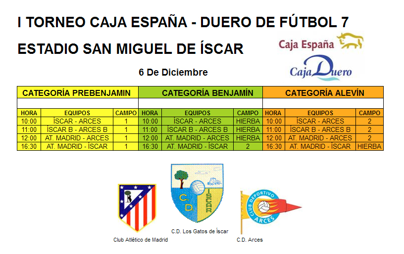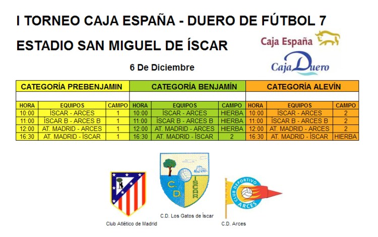 El próximo 6 de diciembre el Club organiza el » I Torneo Caja España – Duero de fútbol base». El formato del torneo será un triangular igual que el de San Miguel, en categorías prebenjamín, benjamín y alevín, con la participación en cada categoría del Atlético de Madrid, Arces y C.D. Los Gatos de Íscar. Los equipos B del Íscar disputarán un amistoso con los equipos B del Arces.