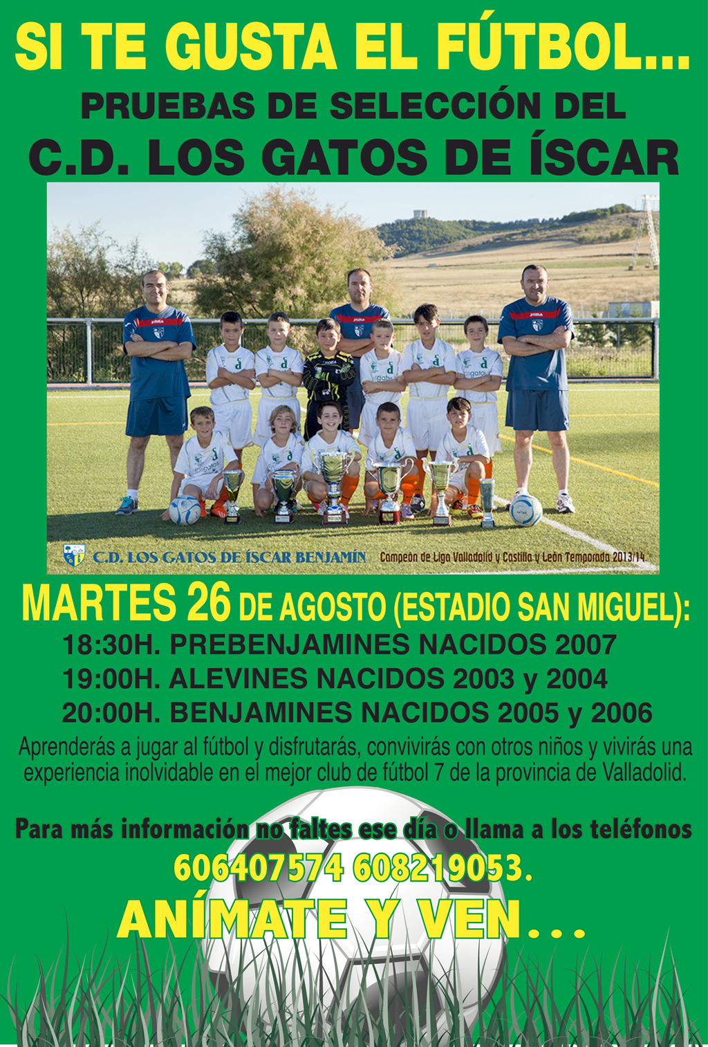 Pruebas de Selección 26 agosto Publicado porcdiscar15 Ago 201427 Ago 2014Publicado en Cantera, Club, UncategorizedEtiquetas:26 agosto 2014, alevin, benjamin, estadio San Miguel, iscar, prebenjamin, Pruebas seleccion c.d.losgatos de iscar Compartir esto: Compartir en Facebook (Se abre en una ventana nueva) Facebook Compartir en WhatsApp (Se abre en una ventana nueva) WhatsApp Compartir en X (Se abre en una ventana nueva) X Más Imprimir (Se abre en una ventana nueva) Imprimir Email a link to a friend (Se abre en una ventana nueva) Correo electrónico Me gusta Cargando... Relacionado
