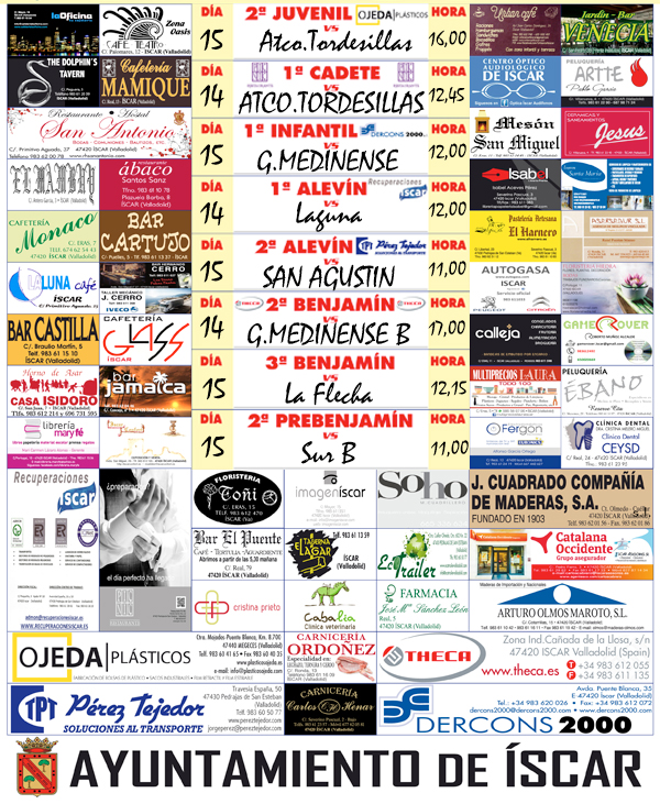 Primera Jornada de Liga de 2017 Publicado porcdiscar11 Ene 2017Publicado en CanteraEtiquetas:14-15 enero 2017, Horarios La competición vuelve este fin de semana 14 y 15 de enero de 2017 con la 12ª jornada de Liga en todas las categorías. Estos son los horarios de nuestros partidos: Compartir esto: Compartir en Facebook (Se abre en una ventana nueva) Facebook Compartir en WhatsApp (Se abre en una ventana nueva) WhatsApp Compartir en X (Se abre en una ventana nueva) X Más Imprimir (Se abre en una ventana nueva) Imprimir Email a link to a friend (Se abre en una ventana nueva) Correo electrónico Me gusta Cargando... Relacionado