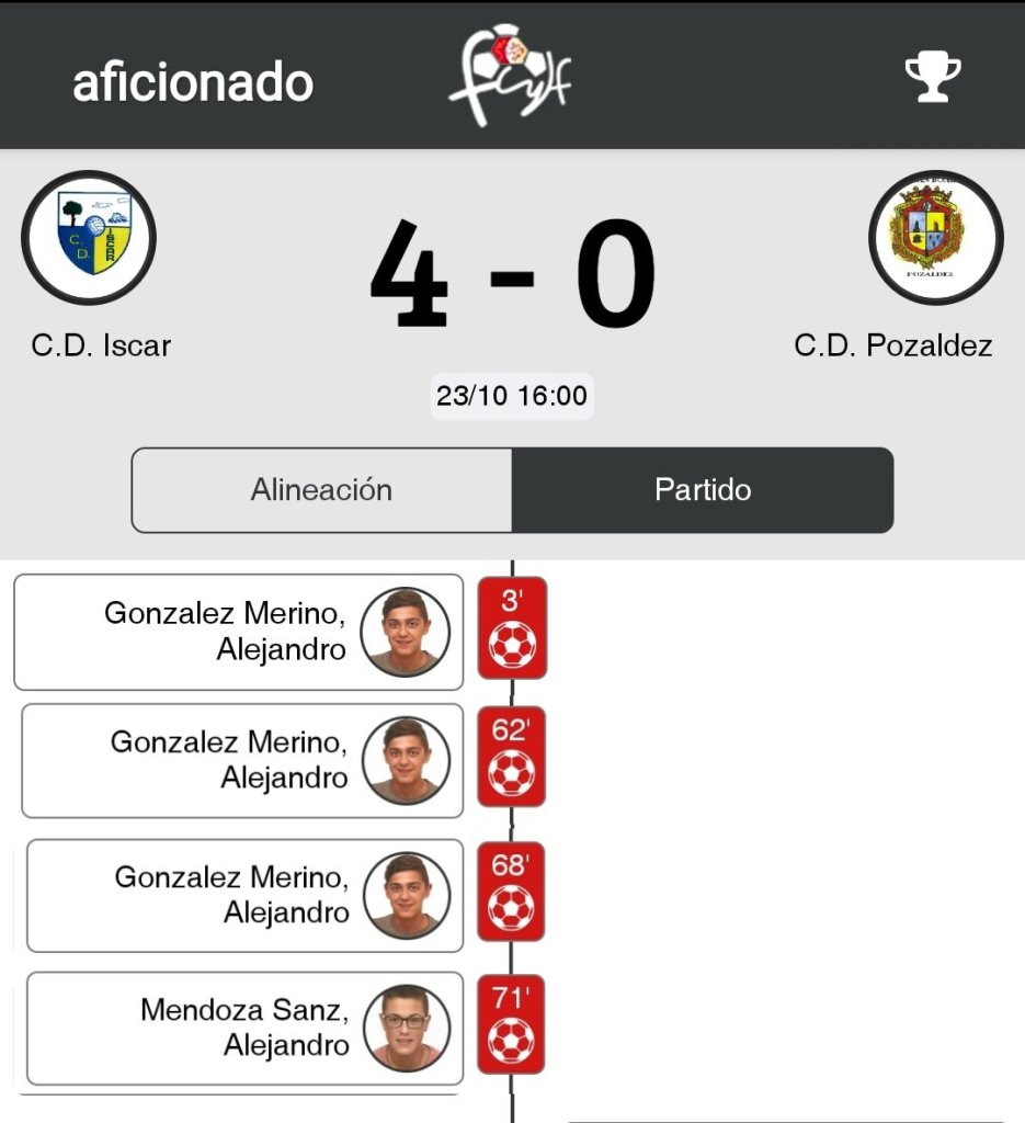 CD Iscar 4 – 0 CD Pozaldez. Con otro hat-trick de Alejandro, más un gol de Mendo y una gran actuación de Arturo, los de Suárez y Boleto consiguieron la cuarta victoria seguida.
