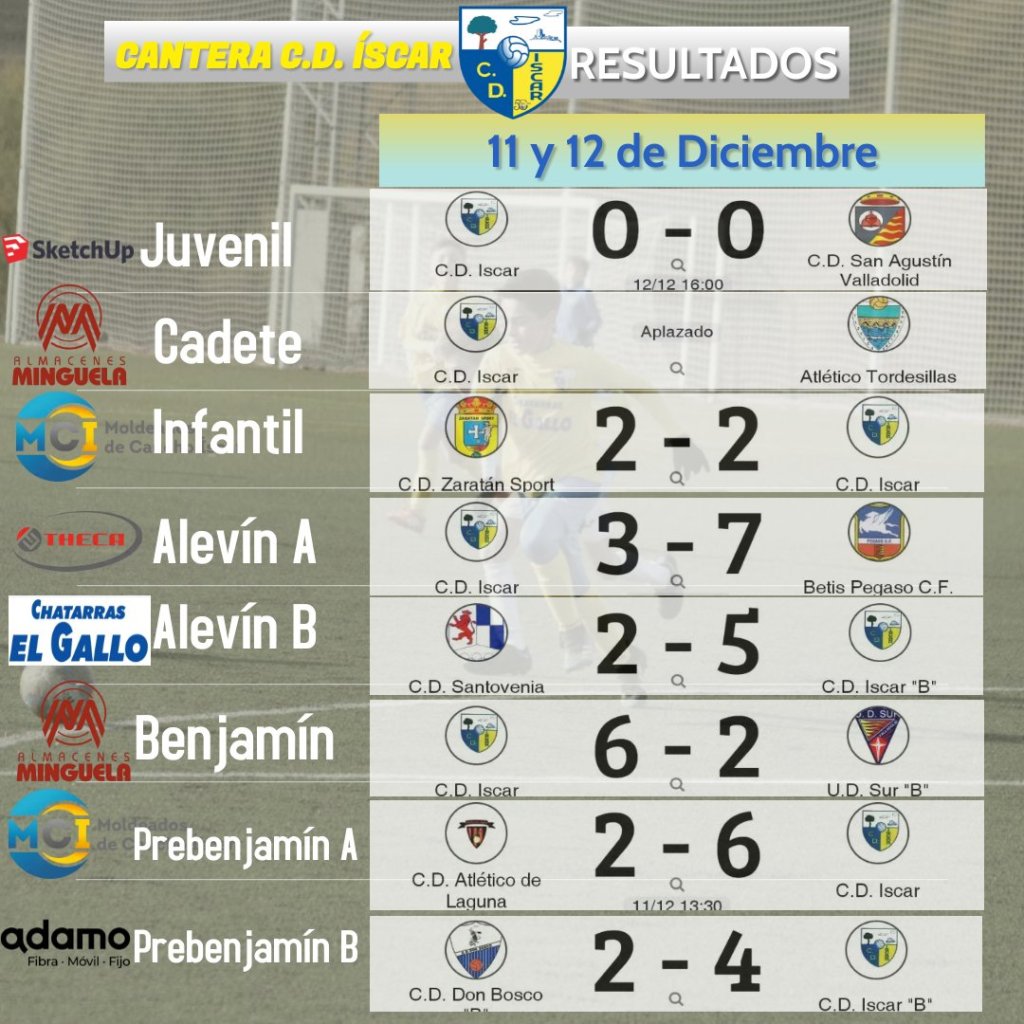 Bonita jornada la de este fin de semana 11 y 12 de diciembre con 4 victorias muy importantes, 2 buenos empates y tan sólo una derrota. Los dos Prebenjamines siguen líderes y el Juvenil continua en racha.