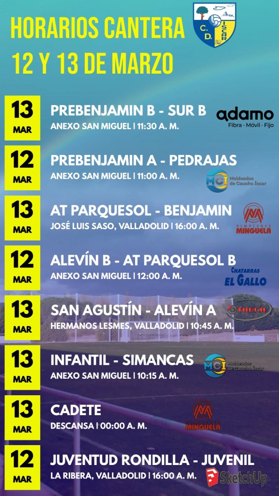 Segunda jornada de Liga de este mes de marzo que disputarán nuestros equipos entre el sábado 12 y el domingo 13 con el derbi Prebenjamin ante el Pedrajas y la última jornada antes del play-off del Aficionado.