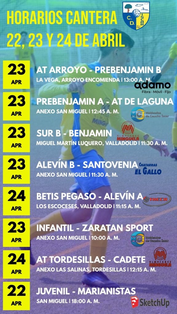 El grueso de la jornada se jugará el sábado con los partidos del Benjamín ante la Sur, el Alevín B contra Santovenia, el Infantil contra Zaratán y los dos partidos de la jornada alrededor del mediodía: el Prebenjamín A contra el Atlético Laguna en casa y el Prebenjamín B en Arroyo, a los dos les basta 1 punto para ser campeones.