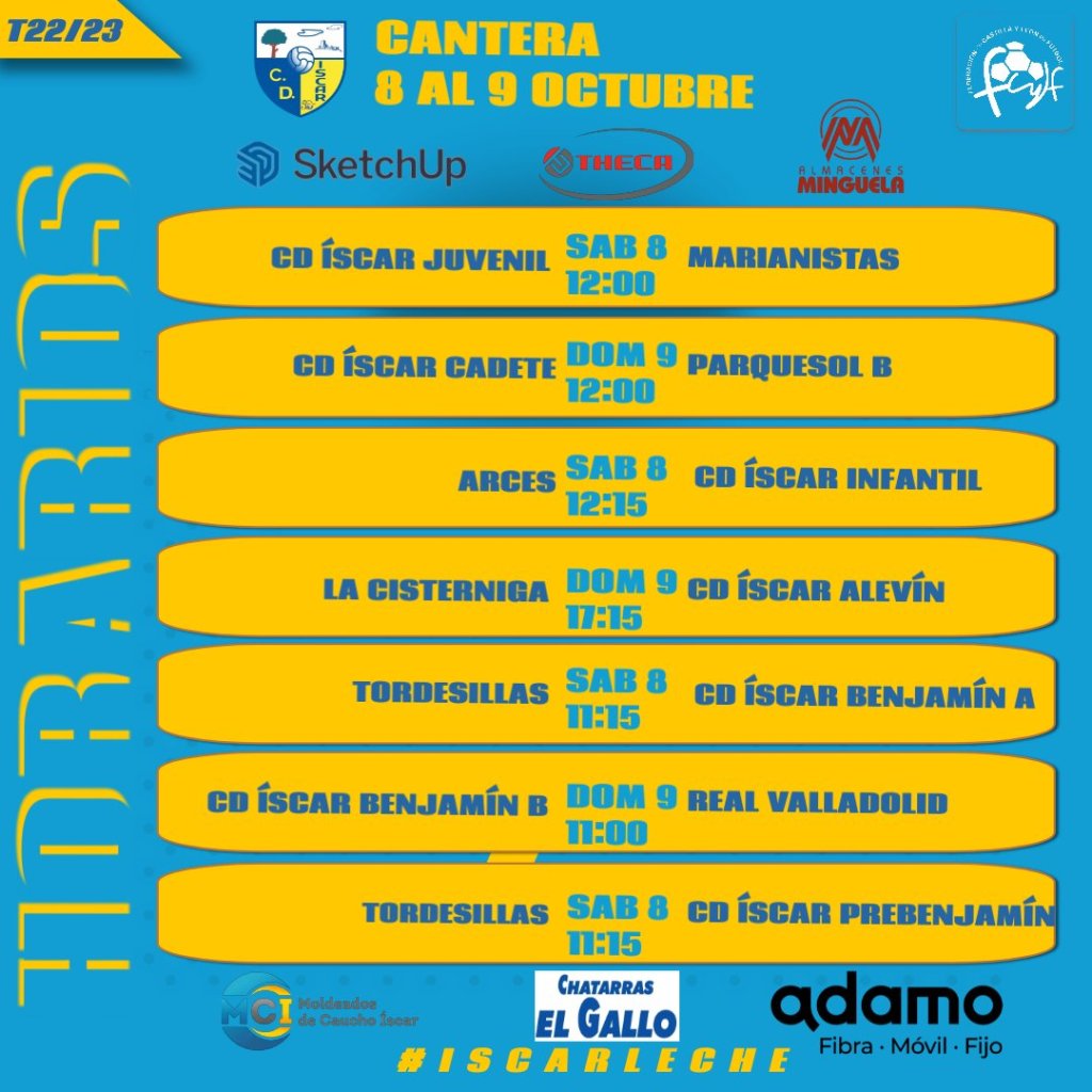 Horarios Cantera 8 y 9 octubre Publicado porcdiscar4 Oct 20224 Oct 2022Publicado en CanteraEtiquetas:8 y 9 octubre 2022, cantera, CD Iscar, Horarios Partidos que nuestros equipos de la Cantera jugarán este fin de semana del sábado 8 y el domingo 9 de octubre Compartir esto: Compartir en Facebook (Se abre en una ventana nueva) Facebook Compartir en WhatsApp (Se abre en una ventana nueva) WhatsApp Compartir en X (Se abre en una ventana nueva) X Más Imprimir (Se abre en una ventana nueva) Imprimir Email a link to a friend (Se abre en una ventana nueva) Correo electrónico Me gusta Cargando... Relacionado