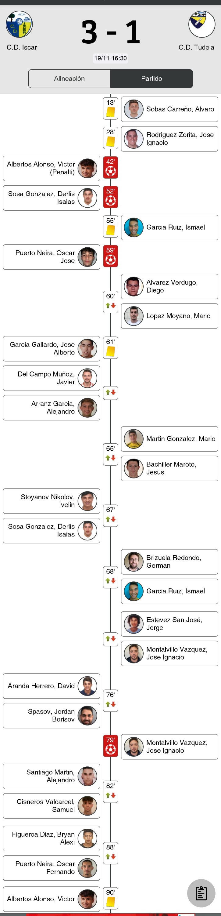 El 1-0 no llegaría hasta el minuto 42 en el que Pitu transformaría un penalti y así se llegó al descanso. Al poco de comenzar la segunda parte, Derlis pondría el 2-0 (Min.52) y 7 minutos después, en el 59′, Óscar sentenciaba con el 3-0. El Tudela lo intentó hasta el final y en el 79′ recortaba distancias y sembraba las dudas en el cuadro iscariense que aguantó bien el arreón final Tudelano y se quedó con los 3 puntos.