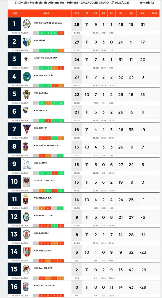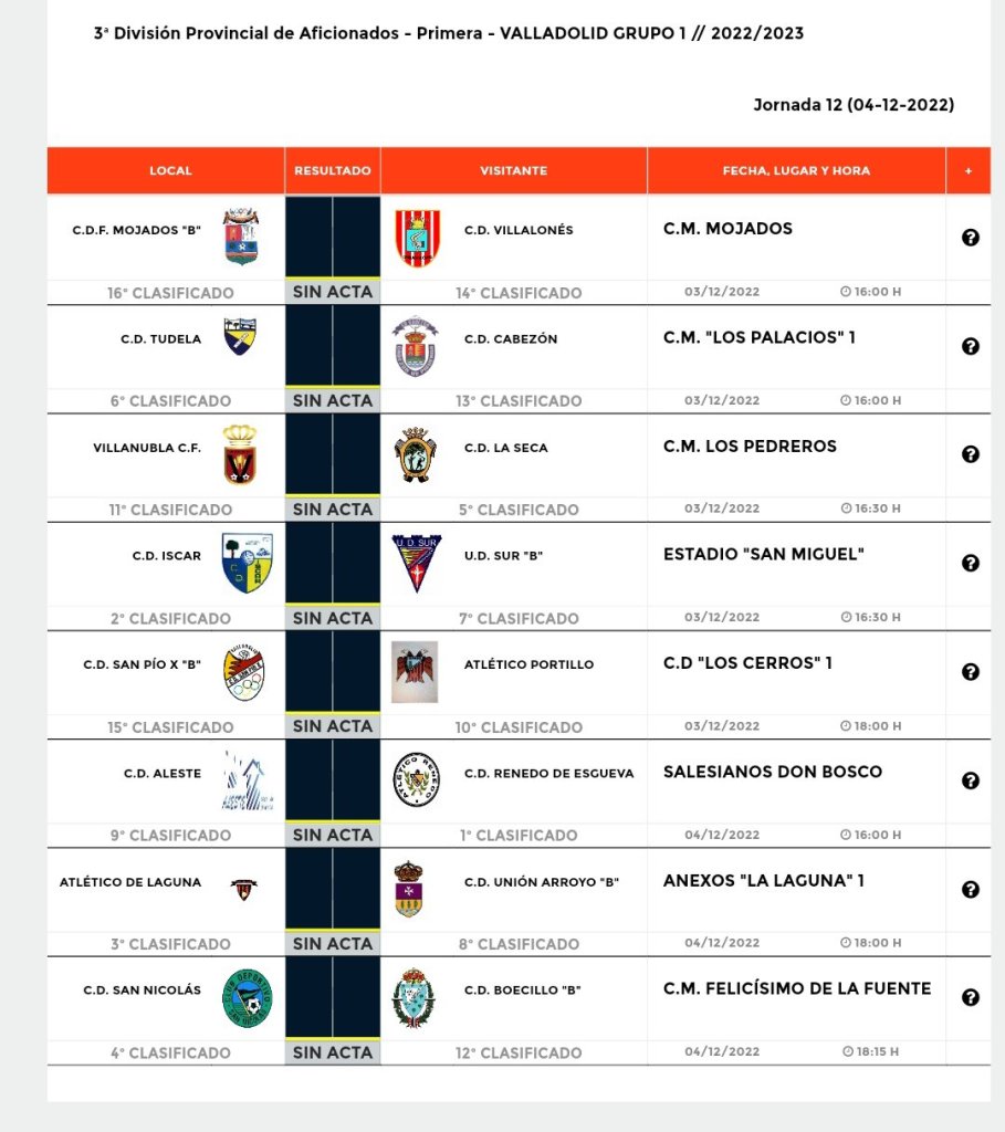 La 12ª jornada completa tiene los siguientes partidos: