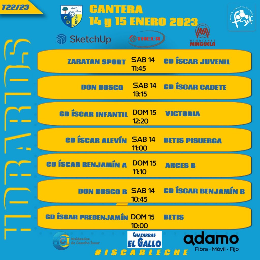 Horarios Cantera 14 y 15 de enero Publicado porcdiscar12 Ene 202312 Ene 2023Publicado en CanteraEtiquetas:14 y 15 enero 2023, cantera cd Íscar, Horarios Partidos de nuestros equipos de Cantera para la primera jornada del año (12ª), 14 y 15 de enero de 2023. Compartir esto: Compartir en Facebook (Se abre en una ventana nueva) Facebook Compartir en WhatsApp (Se abre en una ventana nueva) WhatsApp Compartir en X (Se abre en una ventana nueva) X Más Imprimir (Se abre en una ventana nueva) Imprimir Email a link to a friend (Se abre en una ventana nueva) Correo electrónico Me gusta Cargando... Relacionado