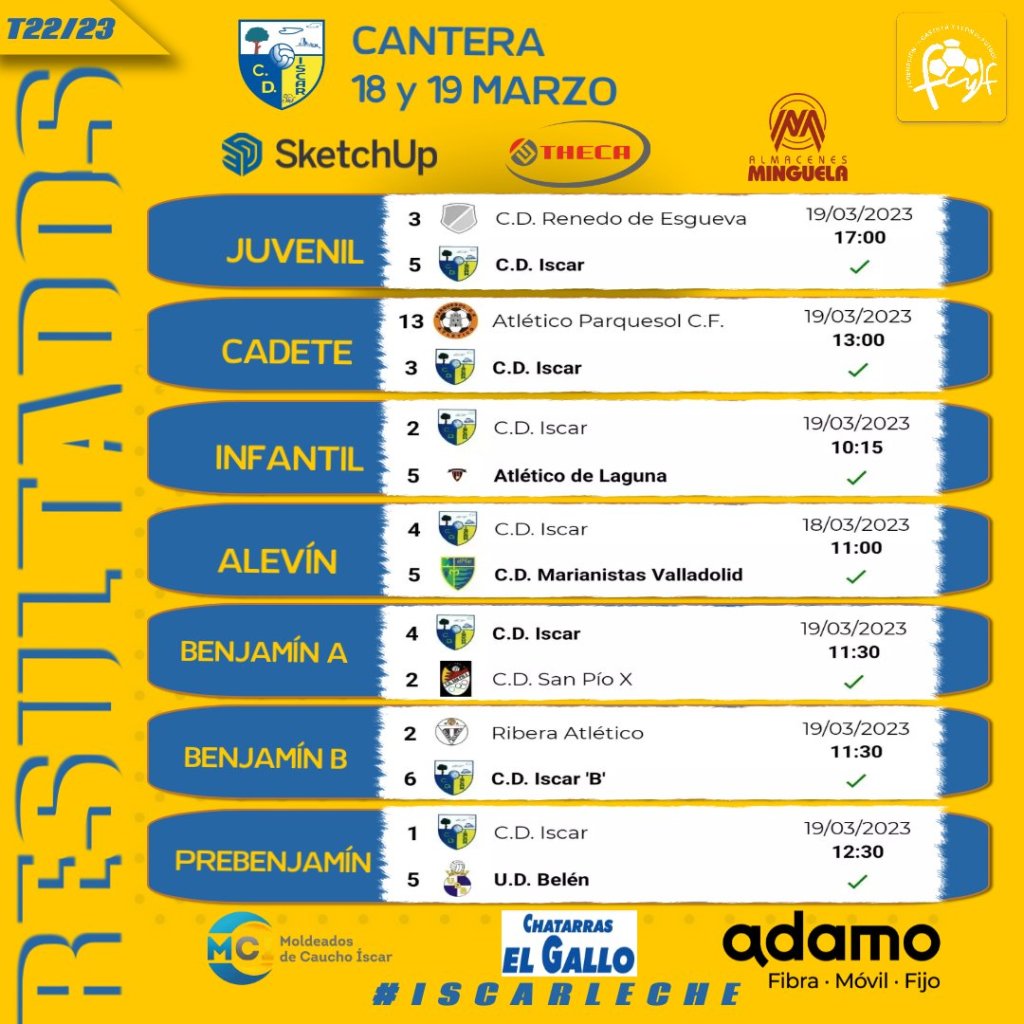 Resultados de nuestros equipos del fin de semana del 18 y 19 de marzo en el que se jugó la 20ª jornada de Liga y en la que el Benjamín A consiguió el ascenso a Primera de manera matemática.