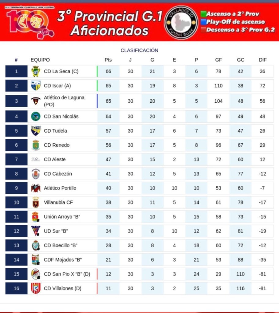 Ascienden directamente a 2ª Provincial el CD La Seca y el CD ÍSCAR y se jugarán la otra plaza de ascenso el Atlético de Laguna y el Racing Valdestillas «B», campeón del Grupo 2.