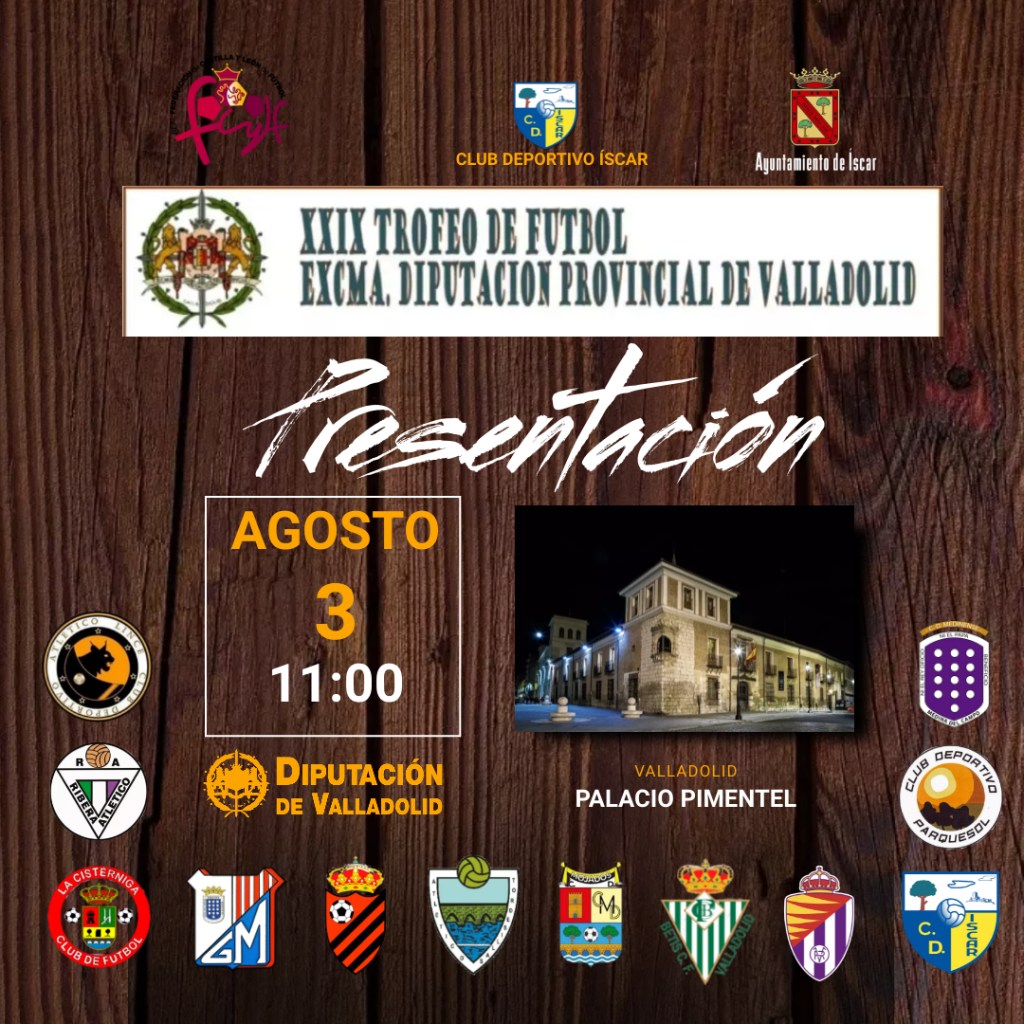 Este jueves 3 de agosto, a las 11 de la mañana en el Palacio Pimentel de Valladolid, tendrá lugar la presentación a los medios de comunicación del Trofeo Diputación que este año se disputa en Íscar organizado por la Diputación de Valladolid con la colaboración el Club Deportivo Íscar, el Ayuntamiento de ÍSCAR y la Real Federación de Castilla y León de Fútbol.