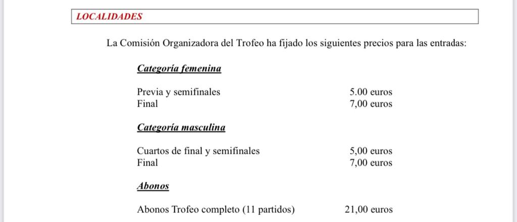 Los precios de las entradas por partido son de 5€ hasta semifinales y de 7€ la final.