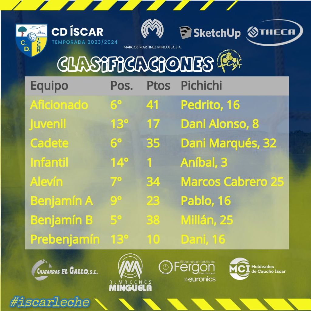El Prebenjamín lucha por no bajar a 3ª y a día de hoy es 13° con 10 puntos. La esperanza no se pierde aunque no va a ser fácil. Su goleador es Dani Muñoz con 16.