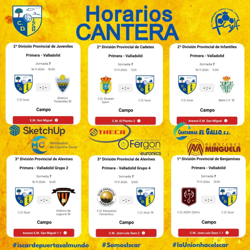 Estos son los horarios de los partidos que jugarán nuestros equipos de la Cantera este fin de semana, 16 y 17 de noviembre.
