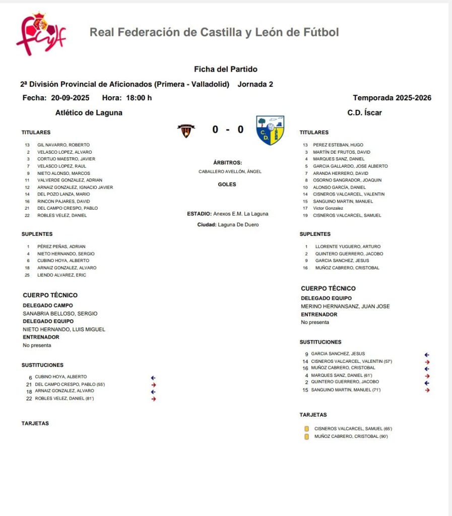 El C.D. Íscar sumó un punto en su visita al Atlético de Laguna en la segunda jornada de la 2ª División Provincial Aficionados, en un encuentro muy igualado que finalizó con empate sin goles (0-0).