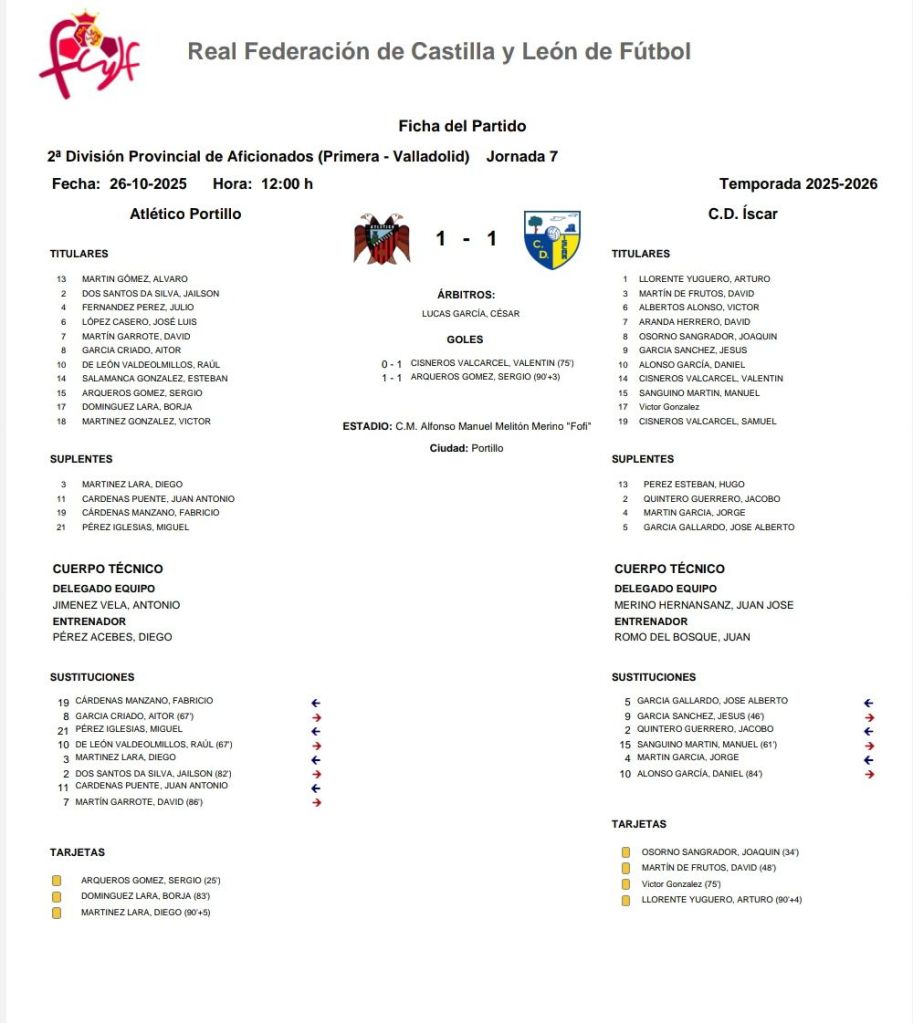 El C.D. Íscar firmó un valioso empate en su visita al Atlético Portillo (1-1) en la 7ª jornada de la 2ª División Provincial de Aficionados (Primera – Valladolid), disputada el domingo 26 de octubre en el C.M. Alfonso Manuel Melitón Merino “Fofi”.