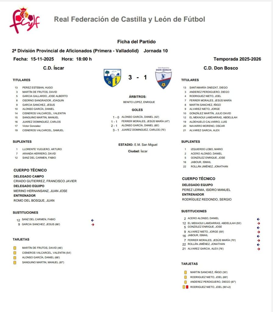 El C.D. Íscar firmó una nueva y meritoria victoria en el E.M. San Miguel al imponerse por 3-1 al C.D. Don Bosco en la Jornada 10 de la 2ª División Provincial Aficionados. Con este triunfo, el equipo encadena dos victorias consecutivas por primera vez en la temporada, un impulso importante para consolidar el buen momento.