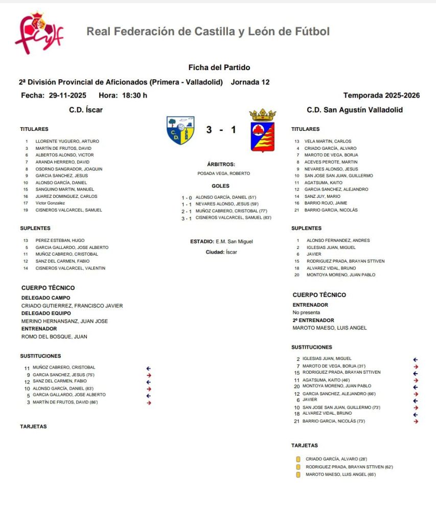 El C.D. Íscar sumó una nueva victoria en la Jornada 12 tras imponerse por 3-1 al C.D. San Agustín Valladolid en el E.M. San Miguel. Un triunfo trabajado, cimentado en la paciencia, el dominio del juego y un excelente tramo final.
