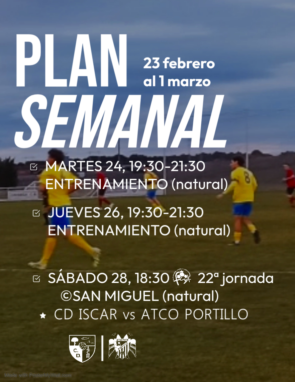 El Club Deportivo Íscar afronta una nueva semana de preparación con el objetivo de llegar en las mejores condiciones al encuentro correspondiente a la 22ª jornada de liga, donde nos mediremos al Atlético Portillo.