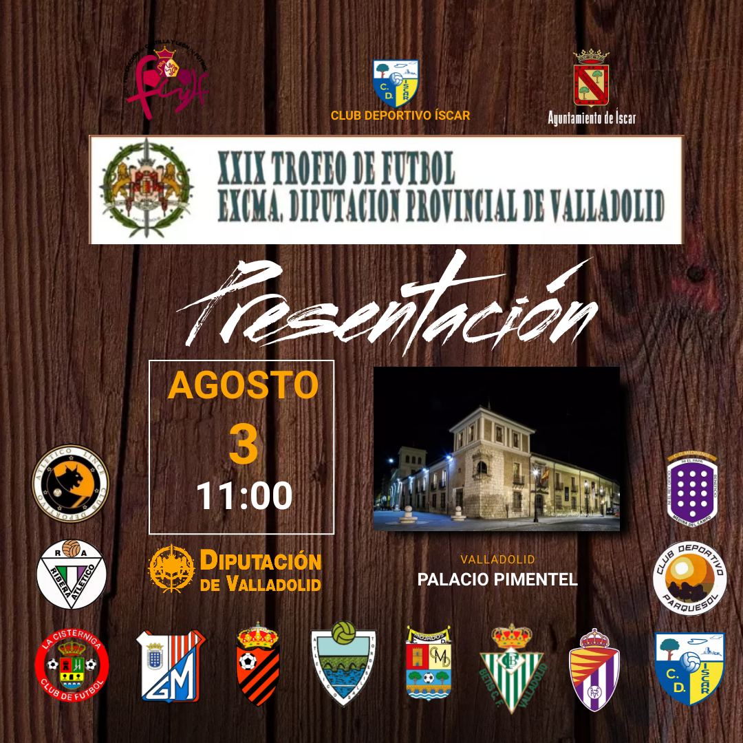 3 de agosto de 2023 Hoy ha tenido lugar en el Palacio Pimentel, la presentación del XXIX TROFEO DIPUTACIÓN DE FÚTBOL, de mano del vicepresidente Víctor Alonso Monje, el presidente de la Delegación Territorial de Fútbol, Manuel Heredia y el Alcalde de Íscar, José Andrés Sanz. Un total de trece equipos participará en el XXIXSigueSigue leyendo «XXIX TROFEO DIPUTACIÓN DE FÚTBOL MASCULINO y III FEMENINO: EN ÍSCAR DEL 14 AL 31 DE AGOSTO»