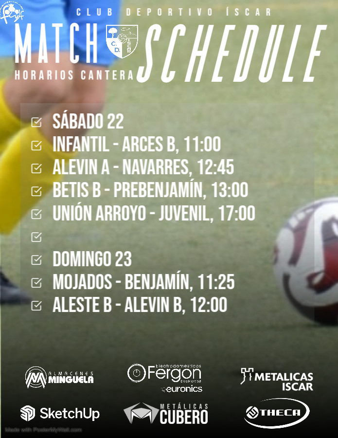 El Club Deportivo Íscar presenta los horarios de los encuentros de nuestra cantera para este fin de semana. ¡Ven a apoyar a nuestros equipos! 📍 Sábado 22 Infantil – Arces B ⏰ 11:00 Alevín A – Navarres ⏰ 12:45 Betis B – Prebenjamín ⏰ 13:00 Unión Arroyo – Juvenil ⏰ 17:00 📍 Domingo 23 MojadosSigueSigue leyendo «Horarios de Cantera – Fin de Semana 22 y 23 de noviembre»