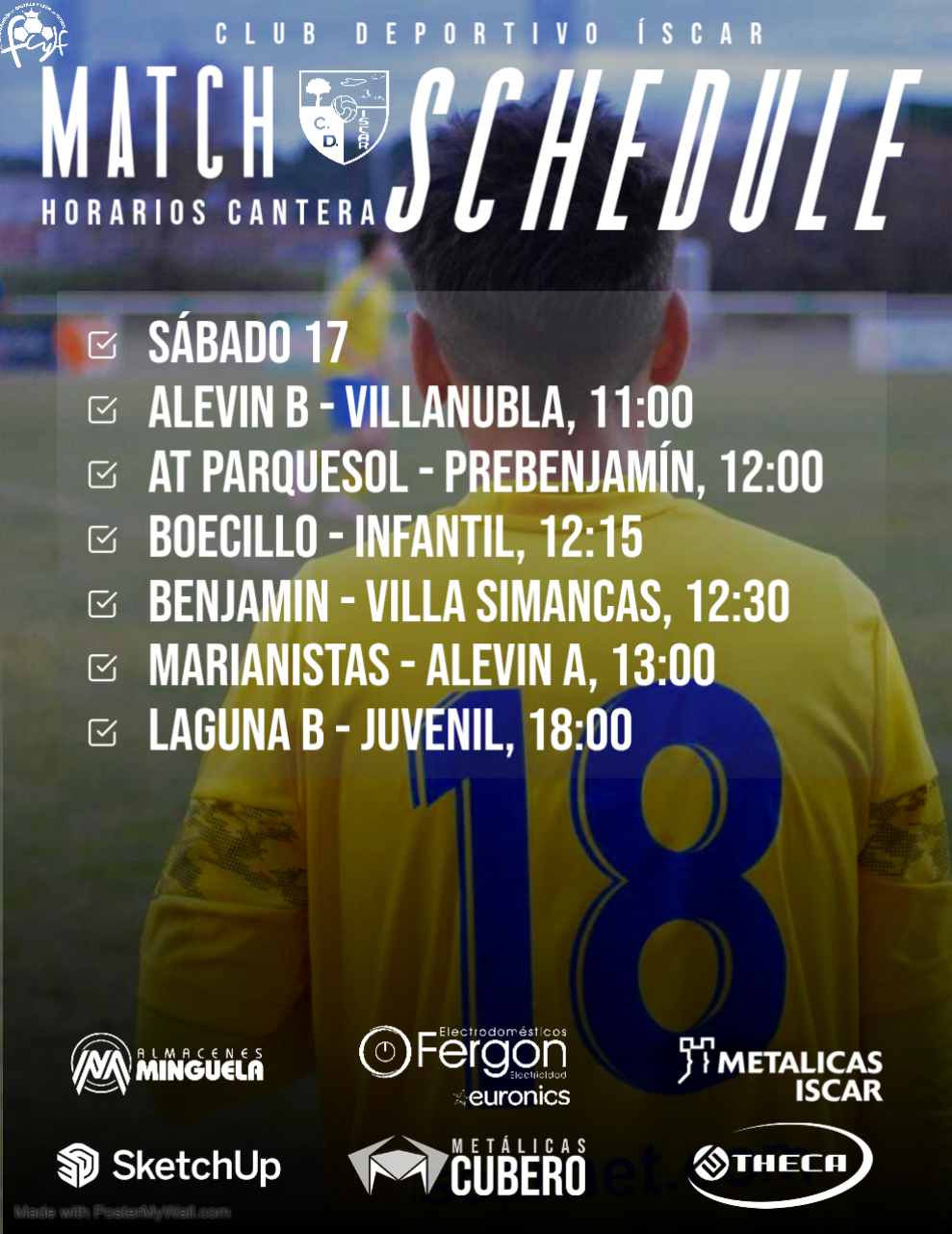 Última jornada del año El Club Deportivo Íscar afronta este sábado 20 la última jornada de competición del año para la cantera, con una intensa mañana y tarde de fútbol base en casa. 🕛Horarios de los partidos: ⏰ 10:55 – San Agustín 🆚 Prebenjamín ⏰ 11:00 – Alevín B 🆚 Tudela B ⏰ 11:30 –SigueSigue leyendo «Horarios Cantera | Sábado 20»