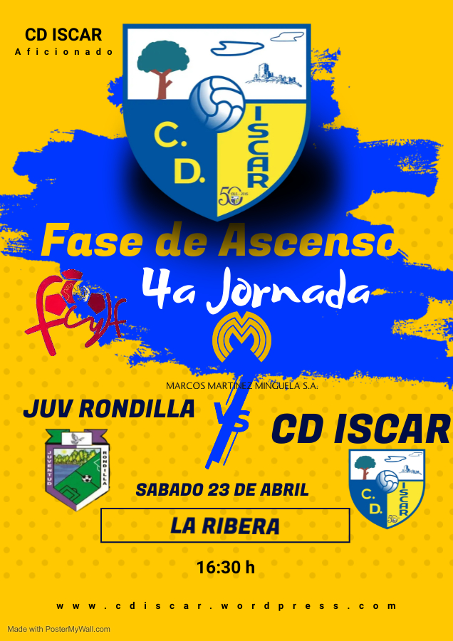Este próximo sábado 28 de mayo el ÍSCAR disputa la novena y penúltima jornada de la Fase de Ascenso a 2a Provincial Aficionado contra el Rondilla en San Miguel. El Íscar necesita la victoria si o si para seguir con opciones de ascenso. El partido es una Final. Ya no hay margen de error ySigueSigue leyendo «CD ÍSCAR – CD Juventud Rondilla, sábado 28 a las 18:30h»