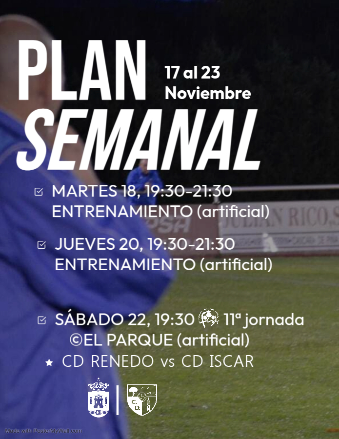 Plan de trabajo del 17 al 23 de noviembre Martes 18/11/2025🏋️ Entrenamiento⏰ 19:30 – 21:30📍Campo Artificial Jueves 20/11/2025🏋️ Entrenamiento⏰ 19:30 – 21:30📍 Campo Artificial Sábado 22/11/2025⚽ Partido vs Renedo🏟️ El Parque de Renedo de Esgueva – Campo Artificial⏰ 19:30 (Vestuario a las 18:30) ¡Vamos equipo!