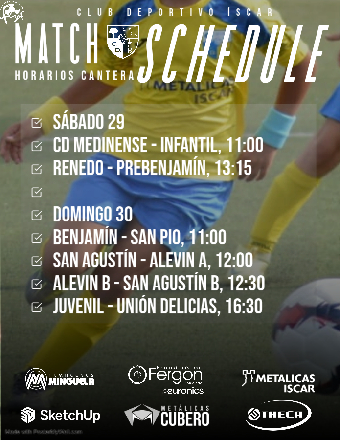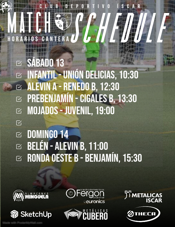 Estos son los partidos de nuestros equipos de cantera del Club Deportivo Íscar para este fin de semana. ¡Mucho ánimo a todos nuestros jugadores! --- SÁBADO 13 Infantil – Unión Delicias, 10:30 Alevín A – Renedo B, 12:30 Prebenjamín – Cigales B, 13:30 Mojados – Juvenil, 19:00 --- DOMINGO 14 Belén – Alevín B, 11:00Sigue leyendo "Horarios de la Cantera – Fin de Semana 13 y 14 de noviembre"