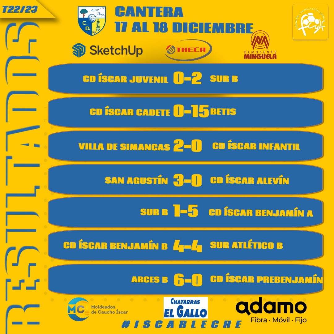 Resultados de la jornada 11 de Liga, última de 2022, disputada este fin de semana 17 y 18 de diciembre por nuestros equipos de Cantera . Benjamín B – Sur Atletico Última jornada del año en un fin de semana que no fue demasiado bueno ya que tan sólo pudieron ganar los dos Benjamines. ElSigueSigue leyendo «La jornada de la Cantera»