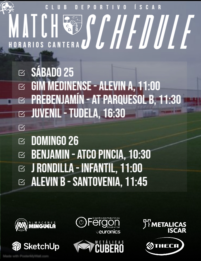 Fin de semana marcado, futbolísticamente hablando, por el clásico Madrid-Barça a nivel nacional pero también a nivel local/comarcal por el cásico Pedrajas-Íscar, esta temporada en categoría Aficionado, la misma que el último disputado entre los dos equipos hace más de 22 años. Además los equipos canteranos tienen un triple enfrentamiento contra el Victoria: Juvenil eSigueSigue leyendo «Horarios del fin de semana (25-26 de octubre)»