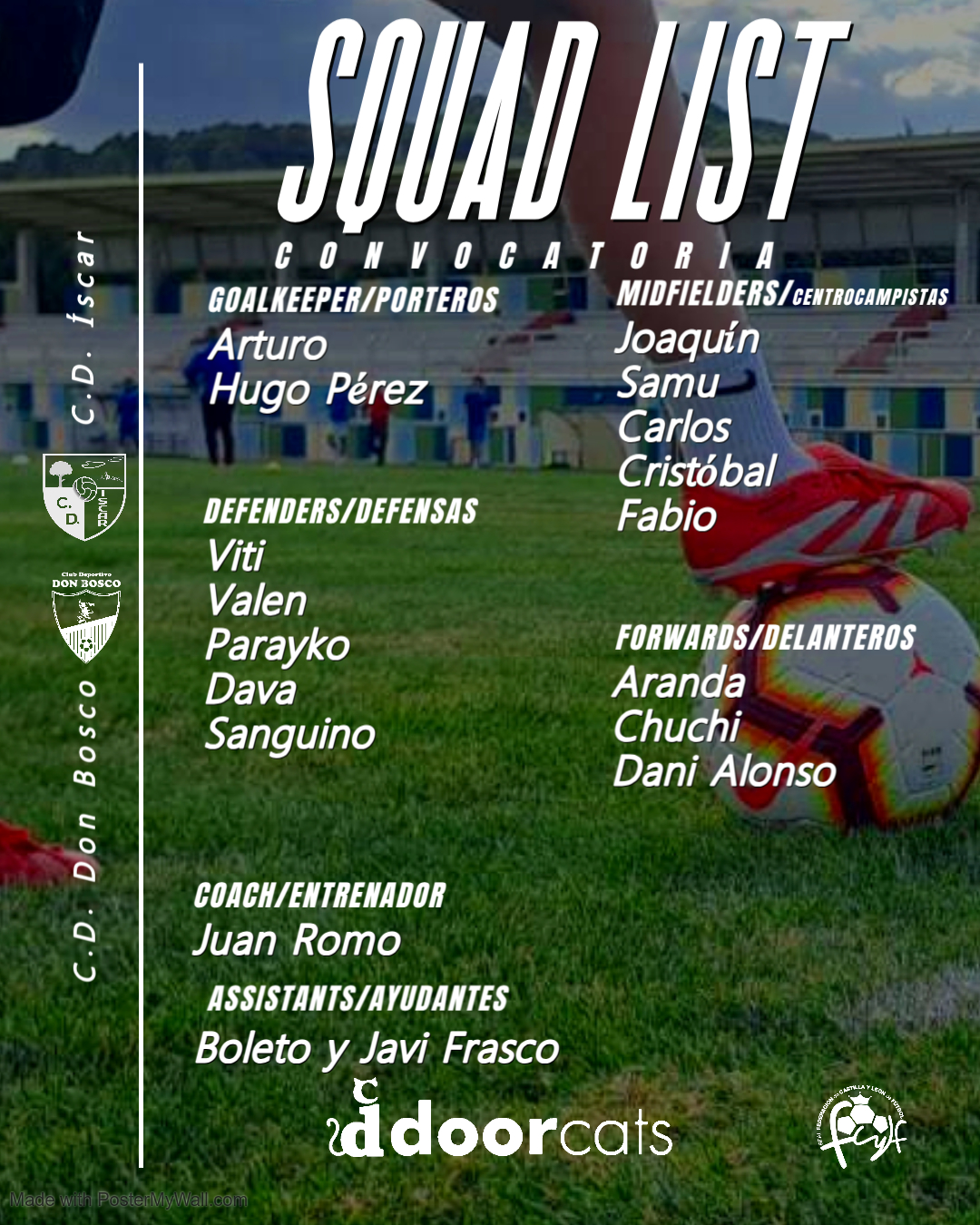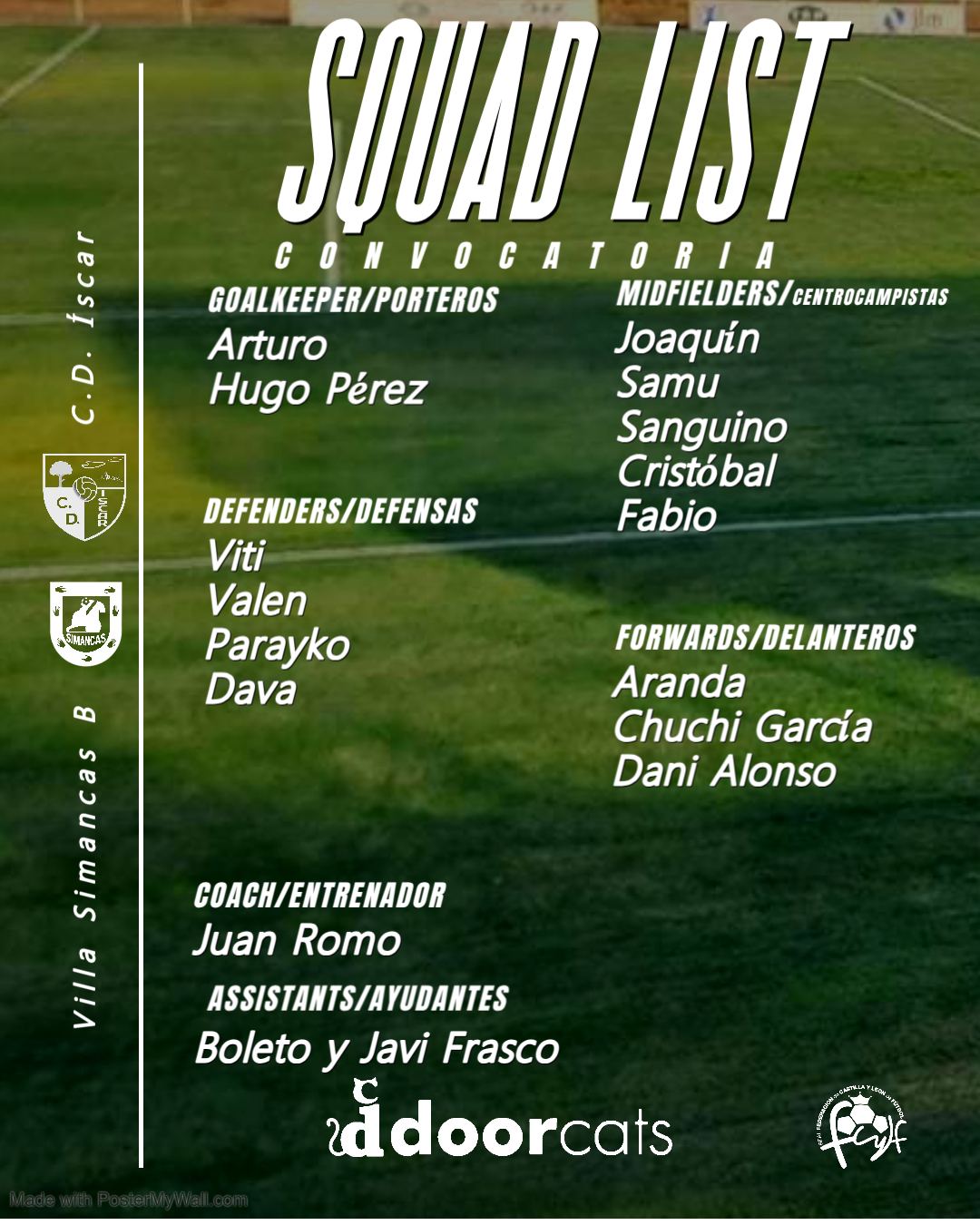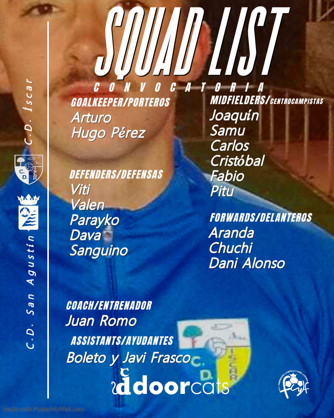 10ª Jornada 📆 Sábado 15/11/25 🏟️ San Miguel, Íscar 🕐 18:00 🆚 Don Bosco 🔊 Convocatoria⏰17:00⏰ Convocados 1 Arturo2 Hugo3 Samuel4 Aranda5 Parayko6 Valentín7 Carlos8 Dani Alonso9 Joaquín10 Dava11 Viti12 Cristóbal13 Chuchi14 Fabio15 Sanguino No Disponibles 1 Pablo Muñoz2 Pitu