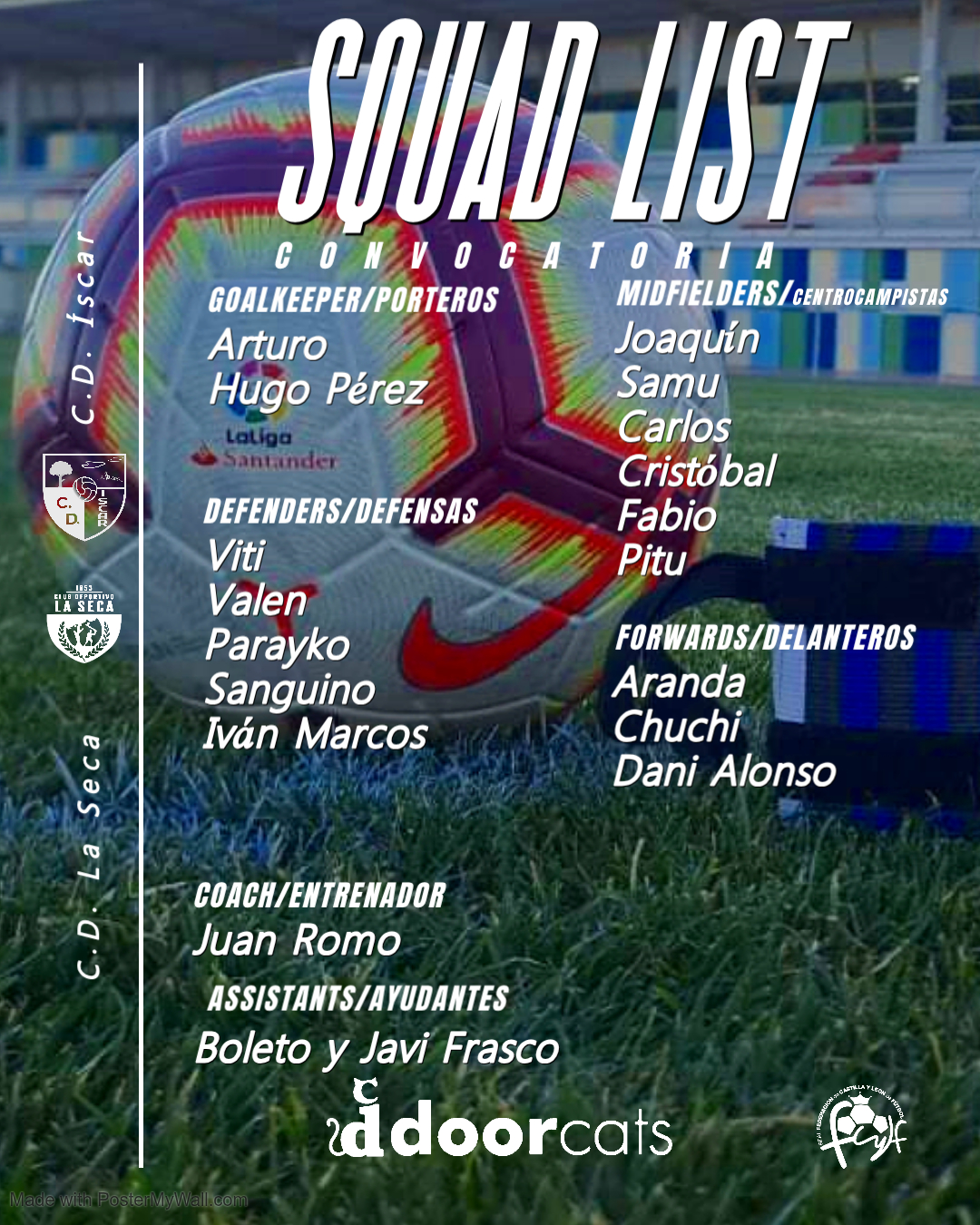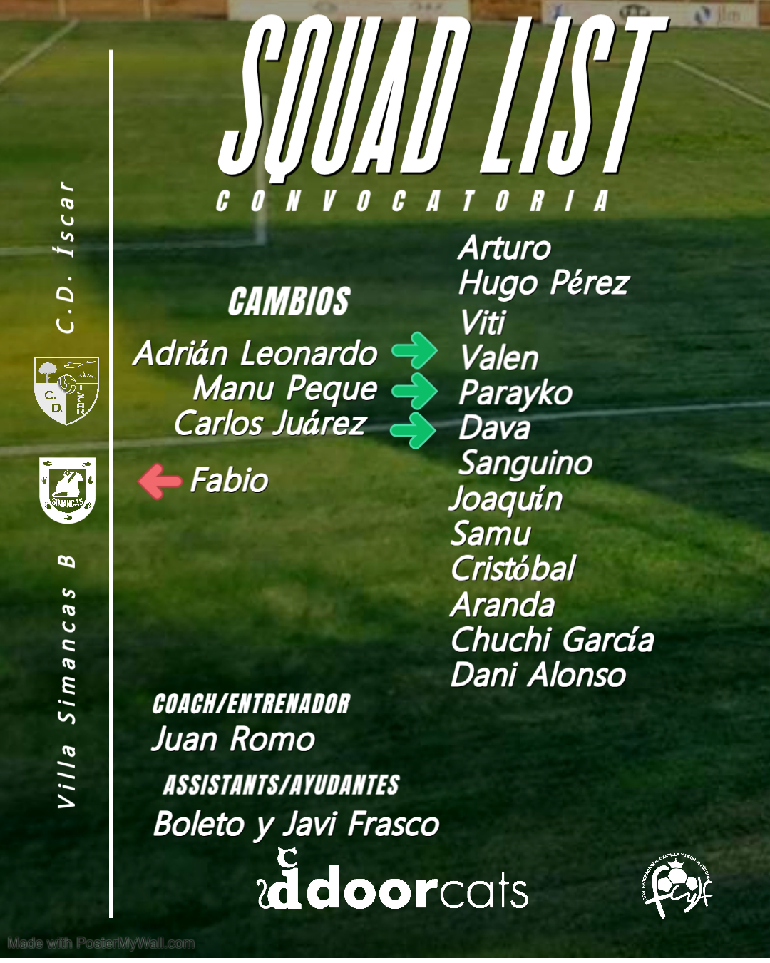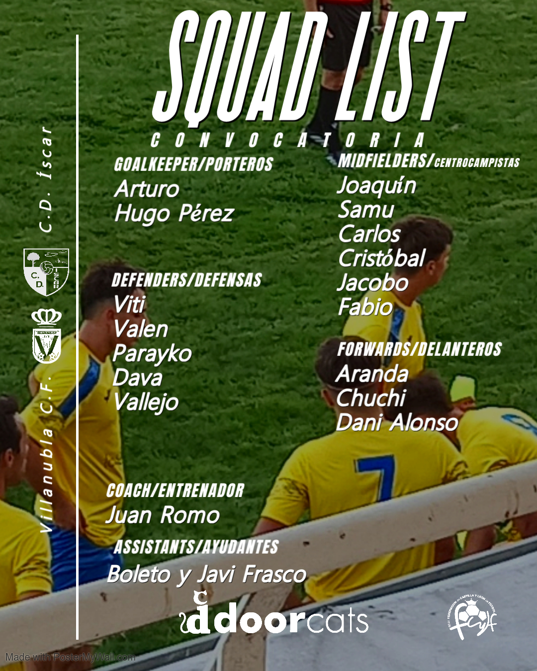 15ª Jornada – 2ª Provincial Aficionado 📅 Fecha: Sábado 10/01/2026🏟️ Estadio: Cigales🕛 Hora: 16:00🆚 Rival: C. D. Cigales 📢 Convocatoria del C. D. Íscar Hora de vestuario: 15:00 Jugadores convocados:ArturoArandaSanguinoValentínDani AlonsoChuchiFabioVitiIvánSamuelParaykoCristóbalCarlosJoaquínDavaHugo ❌ No disponibles:Pablo MuñozPitu ¡A por la victoria, Íscar!