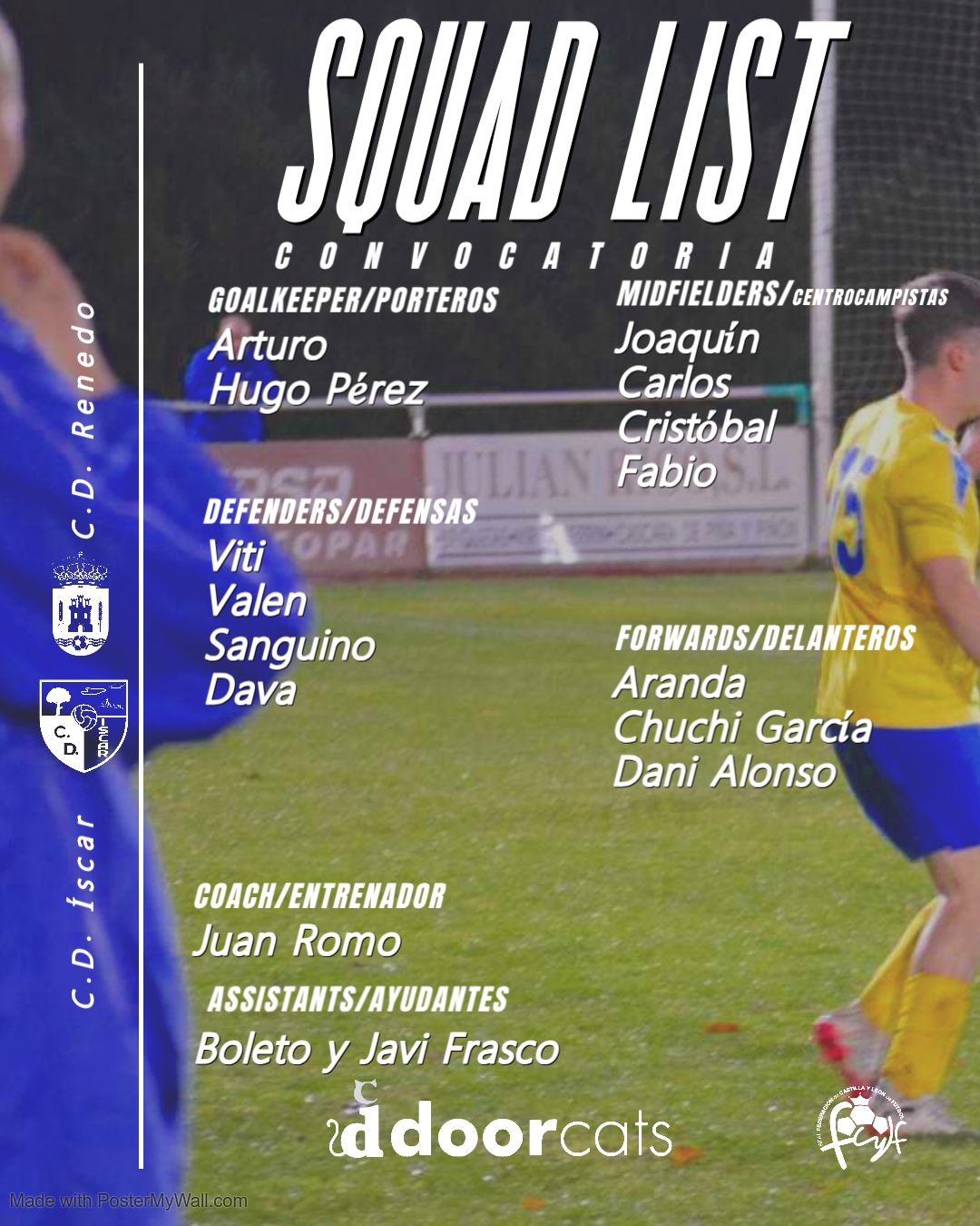 11ª jornada Fecha: Sábado 22/11/2025Estadio: El Parque, Renedo de Esgueva Hora del partido: 19:30Rival: CD Renedo El Club Deportivo Íscar afronta la 11.ª jornada con la siguiente convocatoria oficial.Los jugadores están citados a las 18:30. *Jugadores convocados: Arturo Hugo Fabio Aranda Sanguino Valentín Carlos Dani Alonso Joaquín Dava Viti Cristóbal Chuchi * No disponibles: PabloSigueSigue leyendo «Convocatoria contra C.D. Renedo»