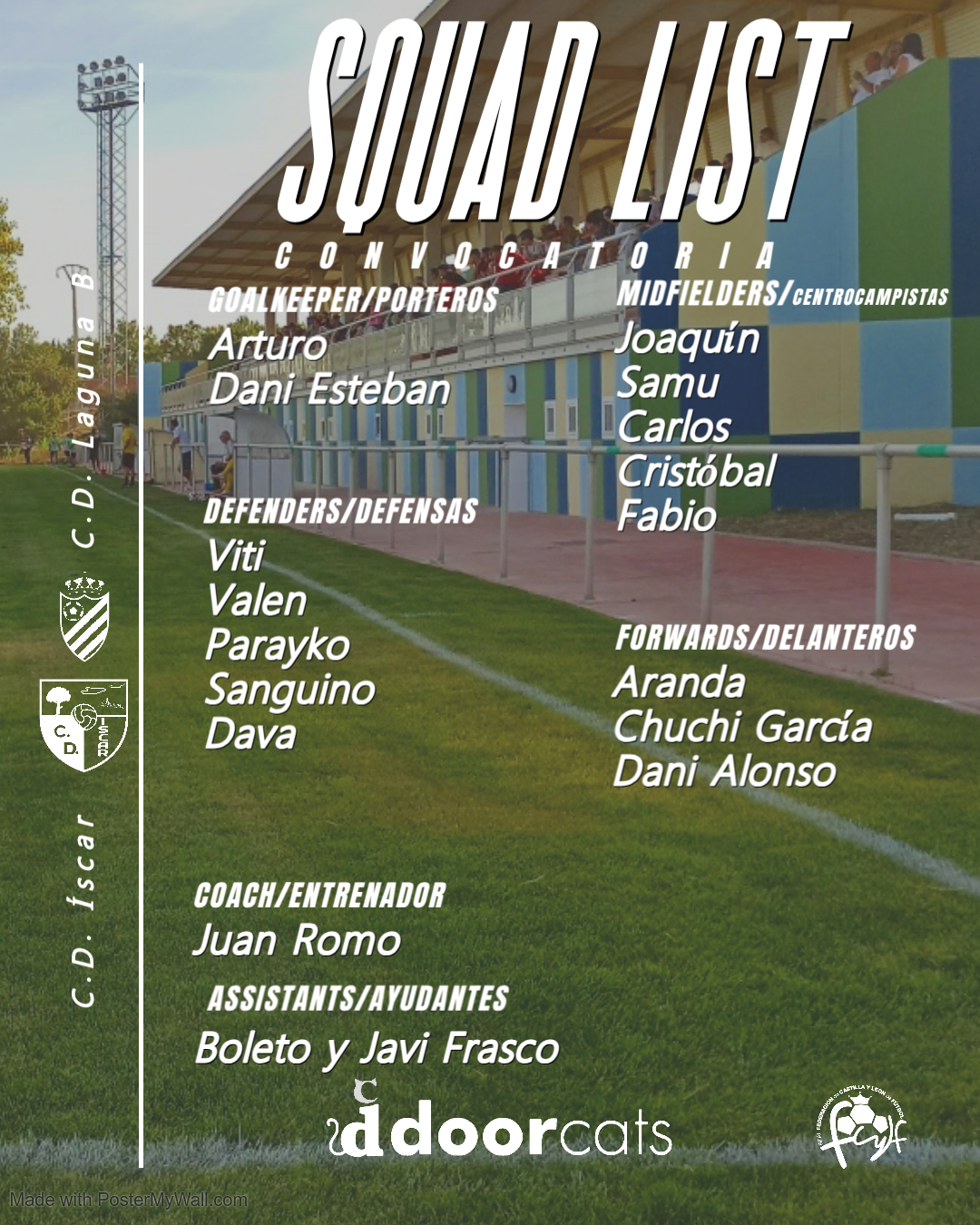 9ª Jornada 📆 Domingo 09/11/25 🏟️ Laguna 🕐 20:00 🆚 Laguna B 🔊 Convocatoria⏰19:00⏰ Convocados 1 Arturo2 Daniel Esteban3 Samuel4 Aranda5 Parayko6 Valentín7 Carlos8 Dani Alonso9 Joaquín10 Dava11 Viti12 Cristóbal13 Chuchi14 Fabio15 Sanguino No Disponibles 1 Pablo Muñoz2 Hugo3 Pitu Nota: Dani Esteban, portero del Juvenil, va convocado por primera vez con el Aficionado.