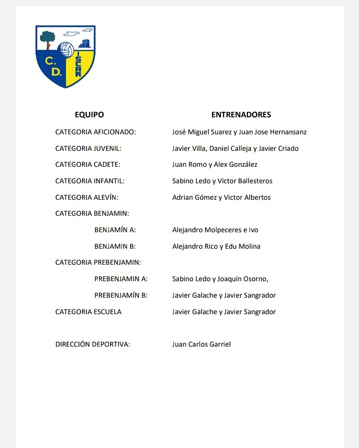 Lista de entrenadores, delegados y encargados de material para esta temporada: AFICIONADO JUVENIL CADETE INFANTIL ALEVIN BENJAMÍN A BENJAMÍN B PREBENJAMÍN Miguel Ángel Pilar Fernando Sanguino
