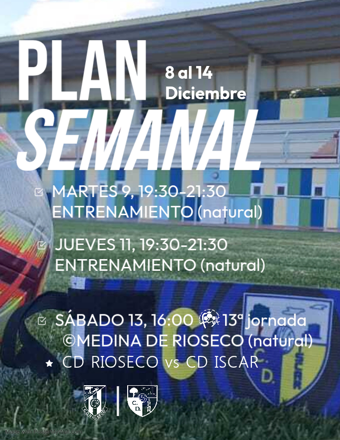 Esta semana continuamos con el trabajo y la preparación de cara al encuentro del sábado. ¡Buena actitud y máxima concentración! 📅 Martes 13/01/2026🏋️ Entrenamiento de 19:30 a 21:30 en Natural 📅 Jueves 15/01/2026🏋️ Entrenamiento de 19:30 a 21:30 en Natural 📅 Sábado 17/01/2026⚽ Partido vs Zaratán en Zaratán🕛 Partido: 16:00 — Vestuario: 15:00🏟️ El PlantíoSigueSigue leyendo «Plan Semanal | 12 al 18 de enero»